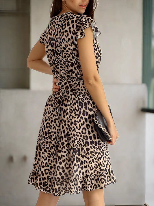 A-line knee-length leopard print dress with high neck, cap sleeves, and cinched waist.