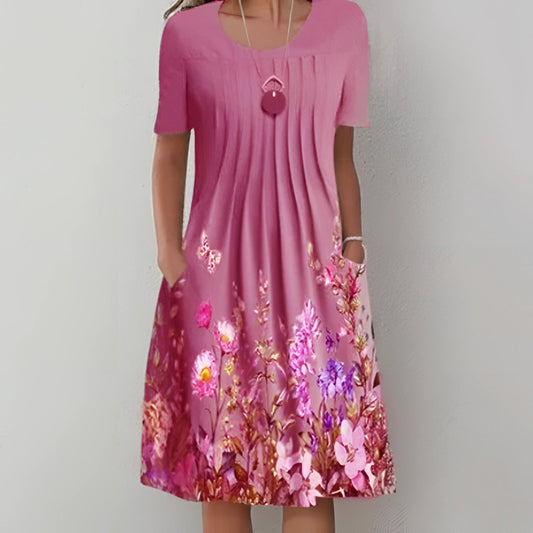 A-Line Midi Dress: Green Floral Pleated, Casual Summer Style, Round Neck