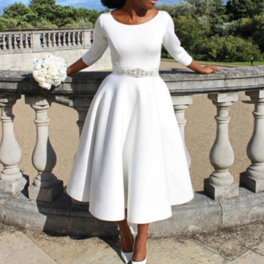 A-Line Red Midi Cocktail Dress: Long Sleeves, Boat Neck, Pockets