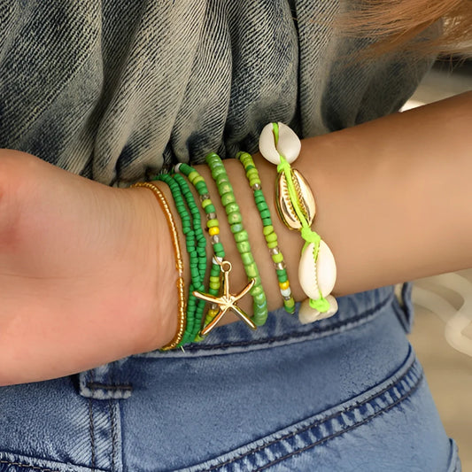 Beach-Inspired Boho Bracelet Set with Gold Seashell and Starfish Charms