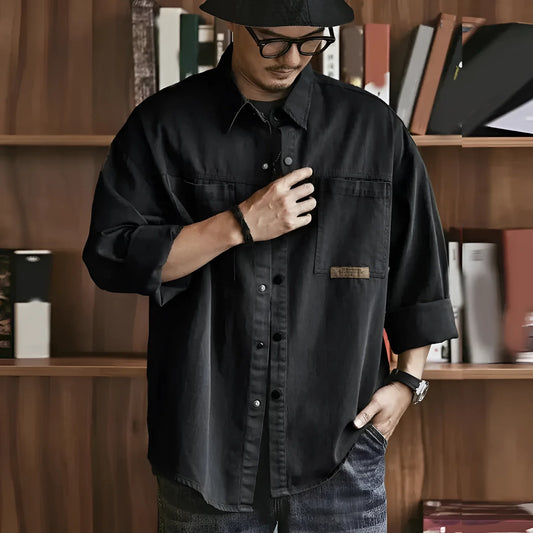 Oversized Long-Sleeve Olive Green Cotton Utility Shirt for Men