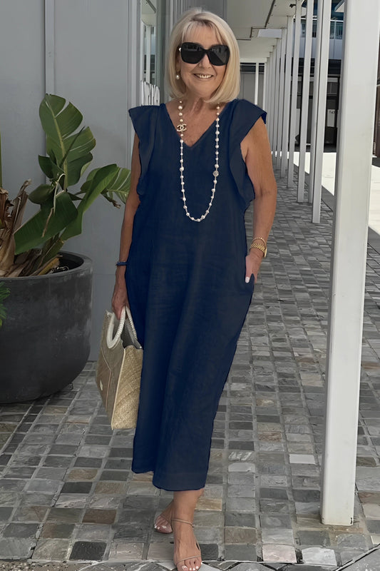 Summer V-Neck White Linen Dress with Pearl Necklace