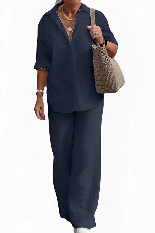 Navy Blue Linen Shirt and Pants Set for Women: A Casual Summer Look